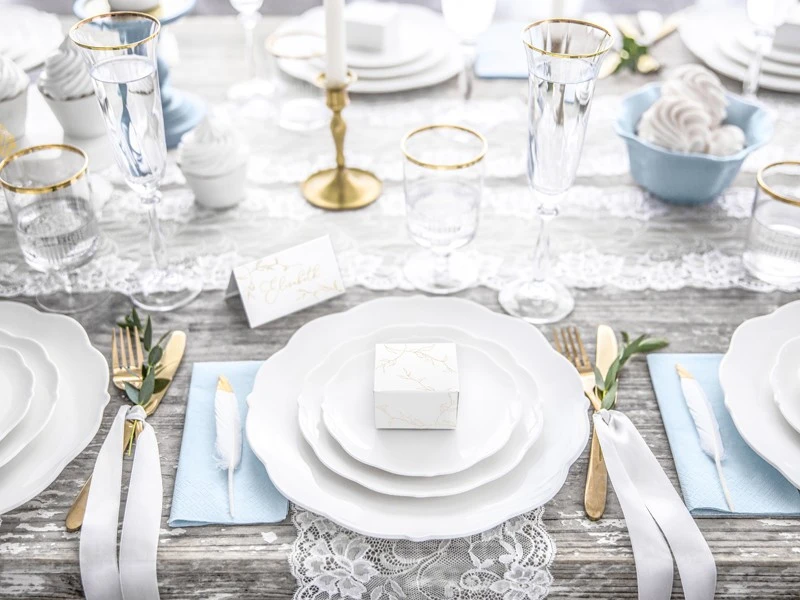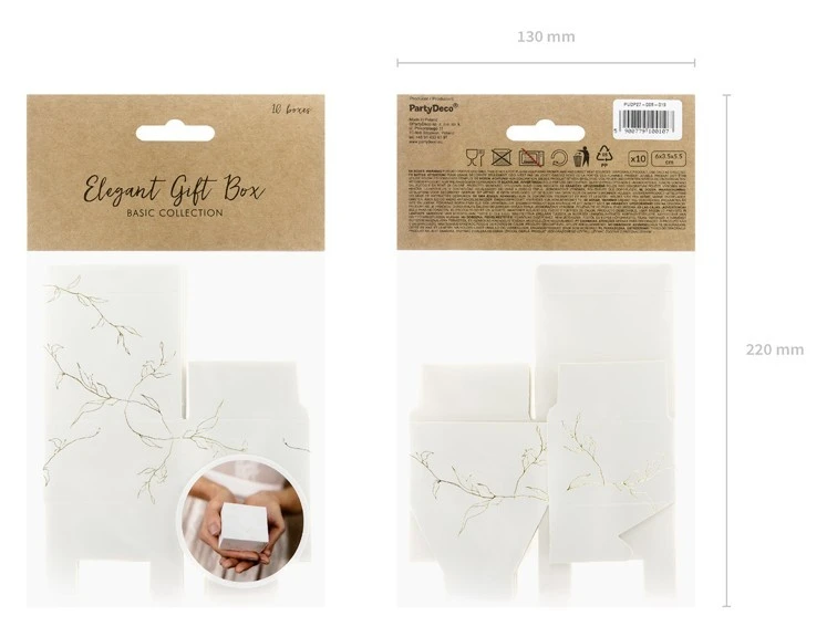 Ces élégants coffrets cadeaux Harmony sont l’emballage parfait pour les petits cadeaux. Les boîtes en carton blanc sont imprimées de branches dorées. Les 10 coffrets cadeaux ont chacun une taille de 6 x 3,5 x 5,5 cm.
